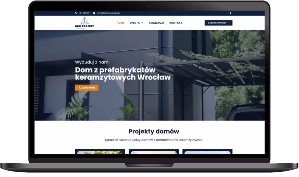 Dla firmy budowlano-projektowej specjalizującej się w budowie domów z keramzytu, stworzyliśmy nowoczesną stronę internetową prezentującą pełną ofertę. Witryna zawiera dostępne projekty wraz z rzutami, interaktywne wizualizacje, opisy realizacji oraz szczegółową ofertę usług.